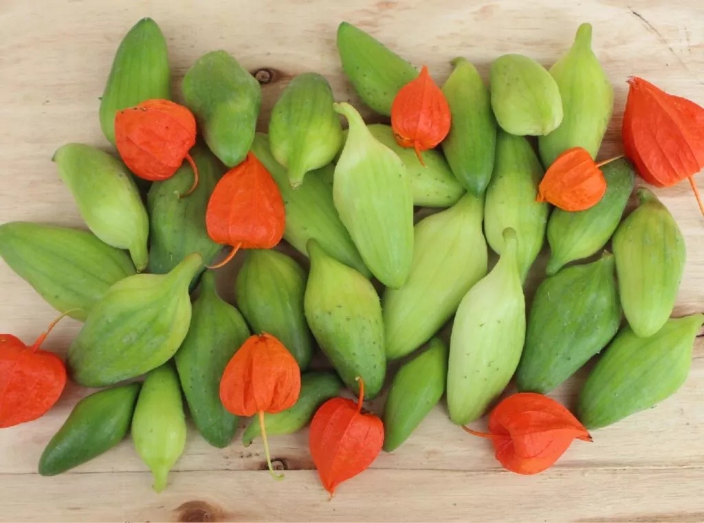 auch Inka- oder Scheibengurke, ein stark rankendes Kürbisgewächs. Die jungen Früchte können roh, gedünstet oder gefüllt genossen, die älteren nur gedünstet oder gekocht gegessen werden. Unter dem Klettergerüst finden die Hühner Schatten und Unterschlupf.